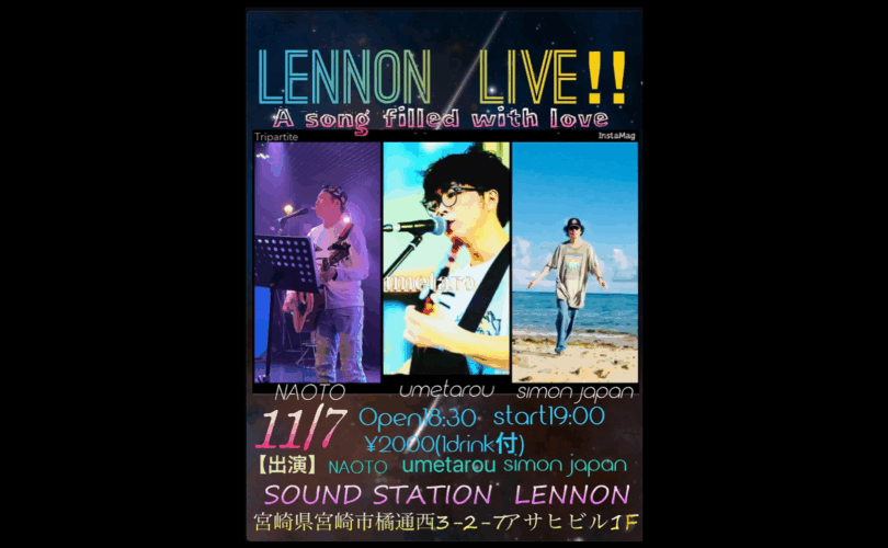 お知らせ リアルライブ情報リアルLennon live!!umetarou-group 2025年11月7日2025年11月7日 11月7日 (金) LENNONにてリアルライブ✨️ 是非、お越しください✨ OPEN 18:30 START 19:00 ¥2,000(1drink付き) 宮崎県宮崎市橘通西3-2-7 アサヒビル1F