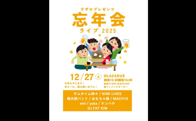 お知らせ リアルライブ情報リアルライブお知らせ✨️umetarou-group 2025年12月27日2025年12月27日 忘年会ライブ✨️@LAZARUS 2025/12/27fri 15:30 OPEN 16:00 START 出演者 ■サムタイム時々 ■NINE LIVES ■梅太郎バンド ■おもちゃ箱 ■MACH10 ■emi ■yuka ■ケンハチ ■DJ FAT KIM 前売り¥1,900 当日¥2,400 1ドリンクオーダー