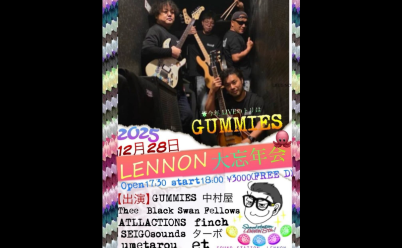 お知らせ リアルライブ情報リアルライブお知らせ✨️umetarou-group更新日 2025年12月28日2025年12月28日 2025/12/28 LENNON大忘年会 17:30 OPEN 18:00 START Freeドリンク ¥3,000 年内最後の生ライブになります。 皆さま是非、お越しください✨️
